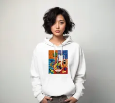 Una natura morta astratta giocosa e colorata con forme decostruite che rappresentano frutta, foglie e vasi. La composizione energica e la tavolozza vivace creano un'interpretazione gioiosa e moderna di un tema classico.