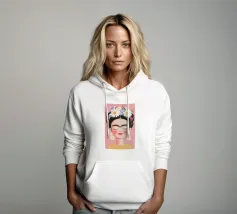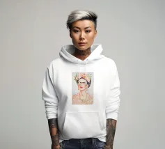 Frida Kahlo risplende in brillanti colori al neon con una corona di fiori e labbra rosse in questo autoritratto ispirato alla pop art che cattura la sua personalità unica e il suo potere creativo.