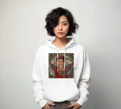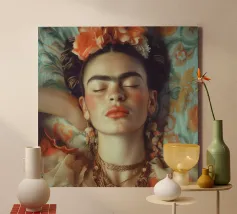Questo ritratto fotografico in stile bohémien ispirato a Frida Kahlo mostra l'artista sdraiata con gli occhi chiusi, incorniciata da una magnifica corona di fiori nei toni del beige e dell'arancione con un accenno di turchese. Gli elementi floreali conferiscono all'opera un tocco botanico ed enfatizzano i tratti caratteristici dell'artista, rendendola un'attrazione digitale unica per qualsiasi interno.