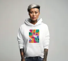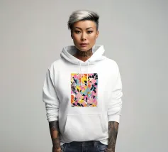 Un motivo audace ed energico che combina la stampa leopardata con fiori e foglie tropicali astratti in una vivace combinazione di colori, creando una fusione selvaggia e alla moda.