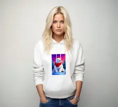 Un orso polare bianco che viaggia in una vorticosa sfera di neve floreale circondata da fiori rosa, stelle scintillanti e rami botanici blu. Ispirato alla vita degli orsi polari canadesi vicino alla tundra aperta e all'aria artica della Baia di Hudson.