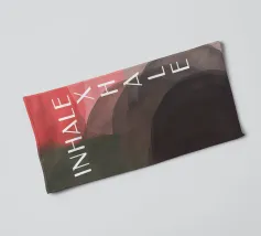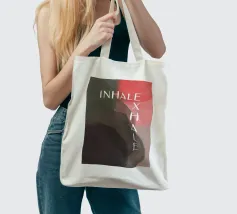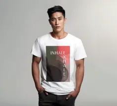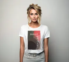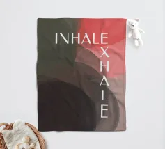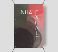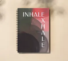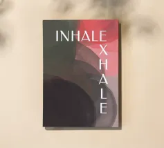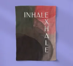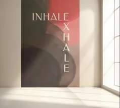 Un design minimalista che traduce la respirazione e la consapevolezza in forme e colori. Superfici delicatamente sovrapposte in verde tenue, rosa e nero formano uno sfondo calmo e organico. Le parole INHALE (orizzontale in alto a sinistra) ed EXHALE (verticale a destra) sono scritte in lettere maiuscole bianche e chiare: ridotte ma efficaci.
