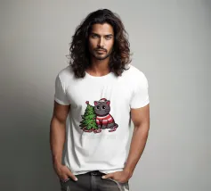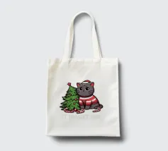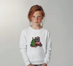 Un simpatico gatto con un maglione a righe bianche e rosse siede innocentemente accanto a un albero di Natale, circondato da decorazioni sparse e bastoncini di zucchero. La scritta "IT WASN'T ME!" sottolinea la scena, aggiungendo un tocco umoristico.
