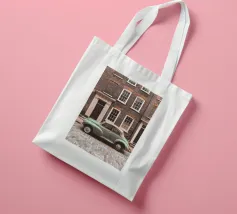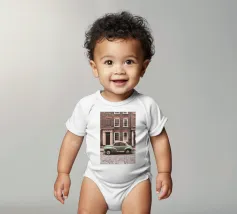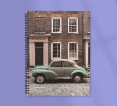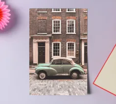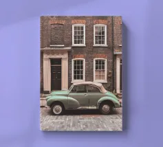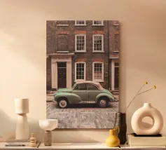 In una pittoresca strada di Londra, un'elegante auto d'epoca passa davanti a facciate di mattoni con un'atmosfera retrò e senza tempo dell'architettura britannica, mescolando storia e nostalgia urbana.