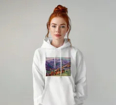Un dipinto paesaggistico espressivo raffigura un fiume che serpeggia in una valle con alberi dalle tonalità autunnali o crepuscolari di rosa, arancione e viola, sotto un cielo drammatico e colorato, che evoca una scena lunatica e vibrante.