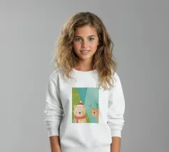 Allegra illustrazione con un orso e un cervo che indossano abiti natalizi accanto a un albero di Natale, irradiando allegria e felicità nel giorno di Natale.