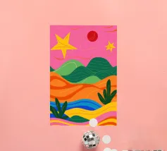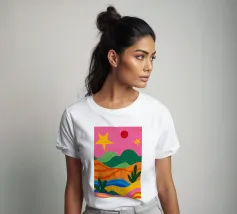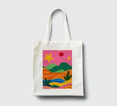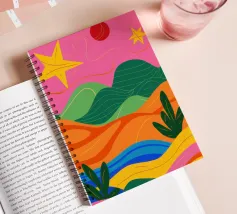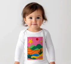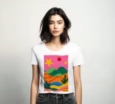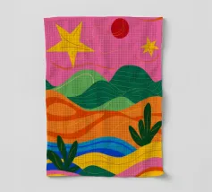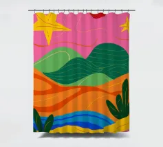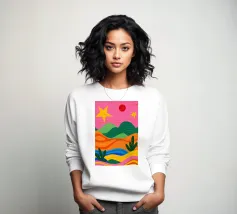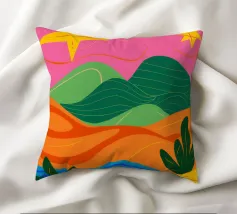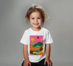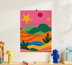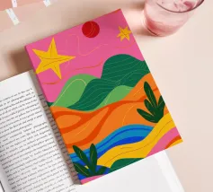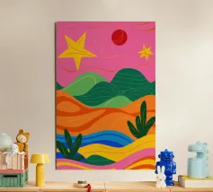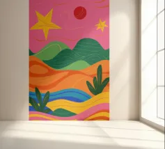 Illustrazione di un paesaggio vivace e fantasioso sotto un cielo rosa con un sole rosso e stelle gialle. Le dolci colline verdi e arancioni sono caratterizzate da un fiume arcobaleno colorato, che crea una scena gioiosa e onirica.