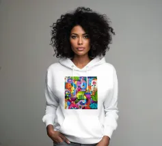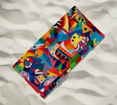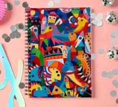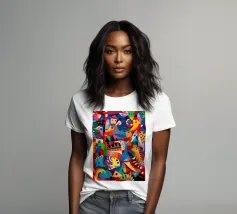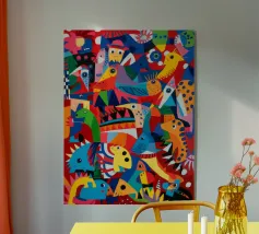 Un paesaggio surreale pieno di figure astratte, animali e forme geometriche. L'uso dinamico di colori vivaci e disegni intricati evoca immaginazione e curiosità.