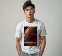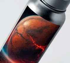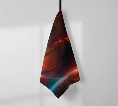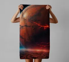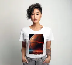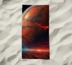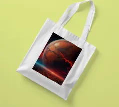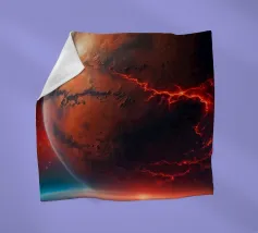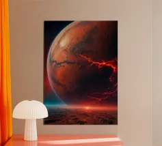 L'immagine ritrae una vista ravvicinata di Marte, che mostra la sua caratteristica superficie rosso-arancio. Un'importante fessura attraversa il pianeta, emettendo un bagliore ardente che suggerisce un'attività vulcanica. Il pianeta è immerso in un cielo scuro e stellato, con una debole nebulosa blu e rossa visibile sullo sfondo.