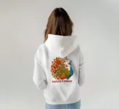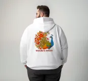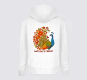 Una lussureggiante illustrazione di un pavone e di un bouquet di fiori rosso-arancio. Una tavolozza calda ed estiva, ideale per creare un'atmosfera botanica e di tendenza nella vostra casa.