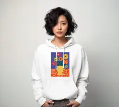 Un vaso a righe bianche e blu contiene fiori gialli e rosa, su uno sfondo vibrante, simile a una trapunta, con motivi floreali rosa, arancioni e rossi.