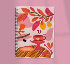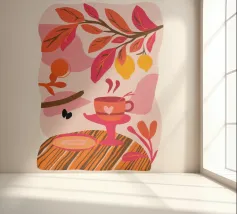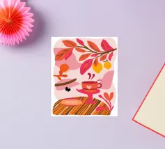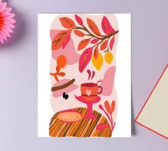 Una natura morta calda e invitante di una tazza di caffè rossa accanto a un ramo di cachi maturi, su una tovaglia a fantasia. La scena è una rappresentazione bella e rilassante di una pausa caffè autunnale.