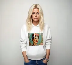 Frida Kahlo gusta il suo caffè in una tazza di fiori, circondata da elementi botanici e accenti floreali. Il suo autoritratto emana eleganza e stile boho, mentre i verdi tenui e i toni della terra sottolineano la sua bellezza naturale.