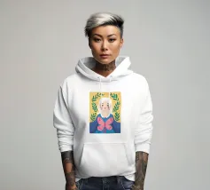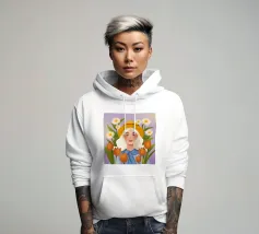 Un'affascinante illustrazione di una bambina con un cappello rosso, che tiene in mano un cesto di funghi. Lo stile stravagante e popolare e la sua dolce espressione creano una scena deliziosa e fantasiosa.