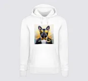 pittura digitale ritratto bulldog francese con abito nero e occhiali da sole dorati