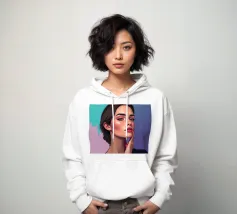 Il ritratto intenso e suggestivo di una donna con capelli scuri, occhi penetranti e un audace rossetto rosso è reso in uno stile pulito, moderno e realistico, che cattura uno sguardo di tranquilla forza e sicurezza.