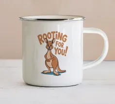 Un allegro canguro si erge su un'ombra blu, accompagnato dal testo "Rooting for You!". Lo sfondo è marrone pieno, per evidenziare il messaggio positivo.
