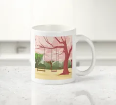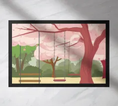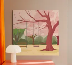 Un'altalena di legno pende da un albero di sakura (ciliegio in fiore) in un parco, con petali rosa tenui che cadono, evocando un senso di tranquillità, nostalgia e la bellezza fugace della primavera.
