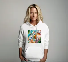 Poster minimalista in bianco e blu di Santorini, in Grecia, con l'iconica architettura cicladica con chiese a cupola, scale a chiocciola e fascino mediterraneo. Questa opera d'arte serena ed elegante cattura la bellezza senza tempo delle isole greche ed è perfetta per gli amanti dei viaggi e dell'arredamento costiero.