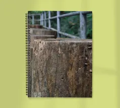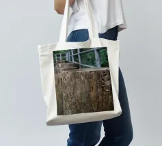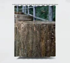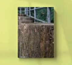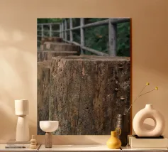 Un sentiero rustico in legno si estende attraverso la passeggiata a baldacchino di un giardino botanico, sostenuto da spessi pali di legno invecchiato che rivelano il passare del tempo. Le trame naturali e le venature sono chiaramente visibili, mentre una semplice ringhiera metallica guida il percorso.