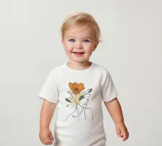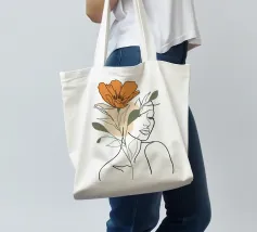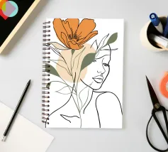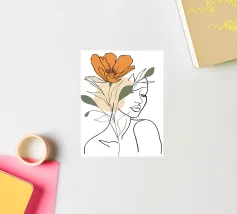 Un disegno al tratto minimalista raffigura un volto sereno intrecciato con un grande fiore arancione e foglie verdi. L'uso di linee semplici e di tonalità della terra crea una composizione elegante e rilassante.