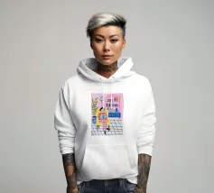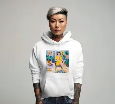 Questa opera d'arte raffigura una persona seduta in una stanza colorata che indossa abiti a righe. Lo sfondo comprende varie piante e mobili, creando un ambiente accogliente e sereno.