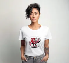 Un allegro personaggio a forma di cuore in stile cartone animato, disegnato come una palla da discoteca, tiene in mano un drink indossando scarpe da ginnastica. La frase "Sipping my way through Valentine's Day" (Sorseggiando il mio modo di passare il San Valentino) si inarca sopra, con "Valentine's Day" (San Valentino).