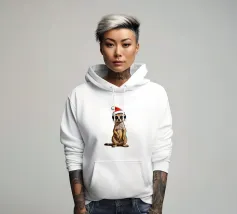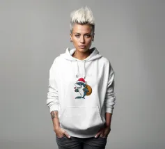 Un simpatico riccio con un cappello da Babbo Natale siede allegramente su una slitta ornata di agrifoglio. Sotto la slitta, la scritta "SLEDGEHOG" aggiunge un tocco giocoso al tema della festa.