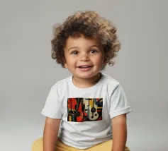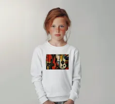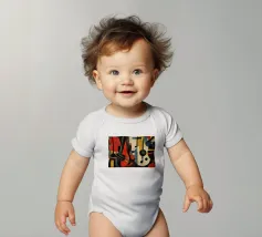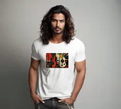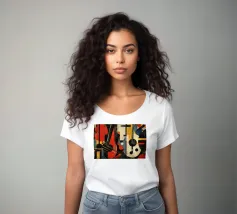 Un moderno dipinto astratto con forme geometriche che formano chitarre, violini e note musicali in una composizione audace e colorata. Lo sfondo strutturato e la disposizione dinamica evocano un senso di ritmo e di espressione artistica.