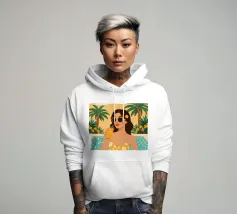 Un'illustrazione audace ed elegante di una donna che sorseggia una bevanda fresca sotto l'alone luminoso del sole. La tavolozza di colori retrò, verde acqua e oro, dona calore, energia e personalità a qualsiasi ambiente. Ideale per cucine, caffè, bar e spazi moderni e luminosi.