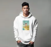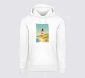 Design minimalista e decorativo di un viaggio estivo con una bella spiaggia e il faro di List-Ost a Sylt. Il tipico faro rosso e bianco che si trova sulle coste del Mare del Nord e del Mar Baltico. Design per vacanze estive per tutti coloro che amano andare in vacanza a Sylt o sulla costa tedesca del Mare del Nord.