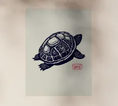 Una dettagliata illustrazione in bianco e nero di una tartaruga con un intricato disegno a linee, su un morbido sfondo beige. Un timbro rosso con la parola "Turtle" aggiunge un raffinato tocco artistico.