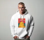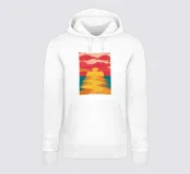 Una rappresentazione drammatica e minimalista di un tramonto sull'oceano, con un sole cremisi che si riflette sull'acqua. I colori decisi e le forme semplici creano una scena potente e suggestiva.