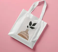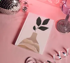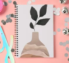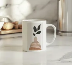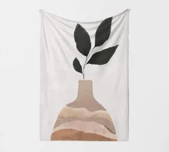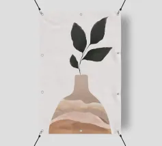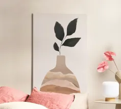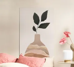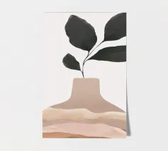Opera d'arte estetica minimalista con un vaso dai toni astratti della terra e tre foglie verde scuro.