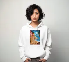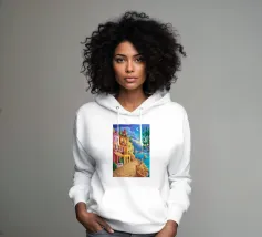 Una veduta prospettica di una strada europea stretta e tortuosa, fiancheggiata da edifici colorati, piante in vaso e diretta verso un cielo luminoso e nuvoloso.