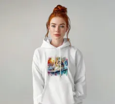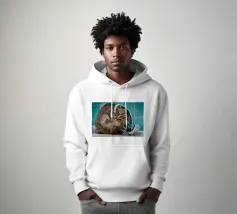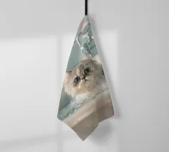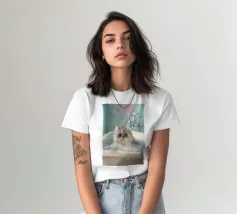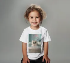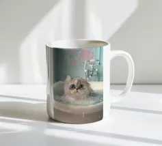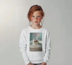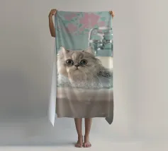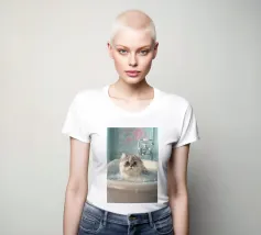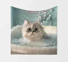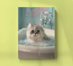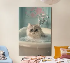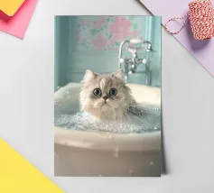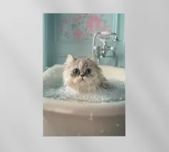 Un soffice gatto con gli occhi spalancati è seduto in una vasca da bagno piena di bolle, circondata da un bagno floreale azzurro e rosa. La scena offre un'espressione stravagante e leggermente sorpresa del gatto bagnato.