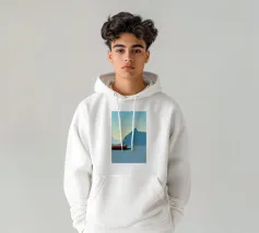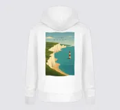 Design di viaggio minimalista dell'Inghilterra meridionale con le famose scogliere bianche (chalk cliffs) e il faro sulla costa inglese vicino a Dover. Tipico paesaggio di scogliere chiare.