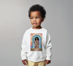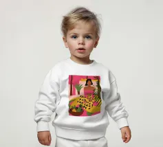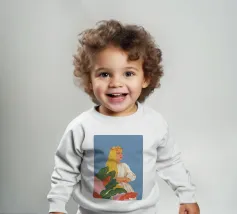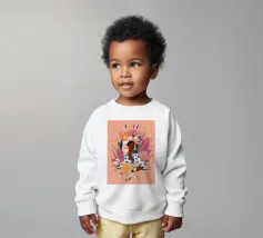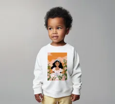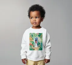 Questa opera d'arte ritrae una persona avvolta da piante verdi e rigogliose, che indossa un abito bianco con motivi arcobaleno. L'arco rosa sullo sfondo aggiunge un sereno tocco botanico.