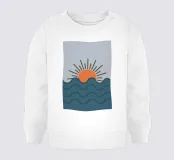 Illustrazione minimalista e serena di un sole che sorge su un mare calmo. Le semplici forme geometriche e la tavolozza di colori tenui creano un forte senso di tranquillità e la tranquilla bellezza di un nuovo giorno.