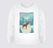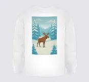 Design minimalista con un alce in una foresta di conifere con abeti o abeti rossi coperti di neve. Design decorativo invernale con un tipico animale selvatico scandinavo, originario tra l'altro di Svezia, Norvegia e Finlandia.