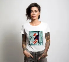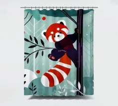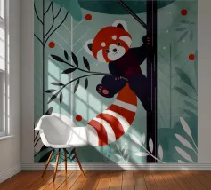 Motivo: Un panda rosso che gioca su un albero circondato da piante tropicali.