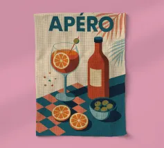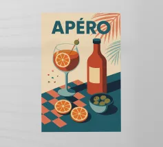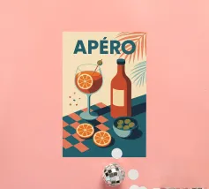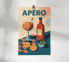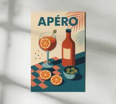 Un omaggio visivo al momento preferito dalla Francia: l'aperitivo. Bicchiere da cocktail, bottiglia di vino, olive, agrumi a fette... C'è tutto. In uno stile grafico colorato e vintage, questo poster risveglia i sensi e invita alla convivialità. Un must decorativo per gli amanti dei momenti semplici e gustosi.
