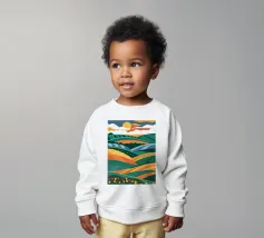 Un paesaggio vibrante e stilizzato di colline verdi e blu sotto un'alba colorata e radiosa, che evoca un senso di speranza, ottimismo e la bellezza di un nuovo giorno.