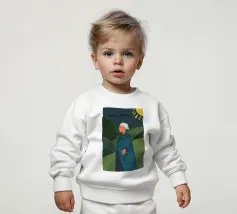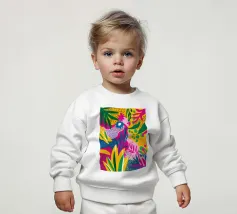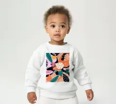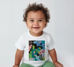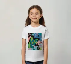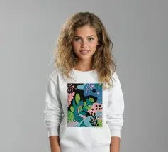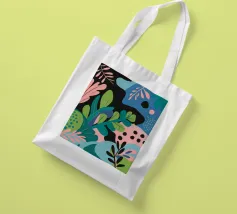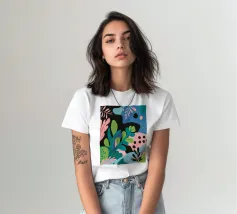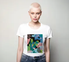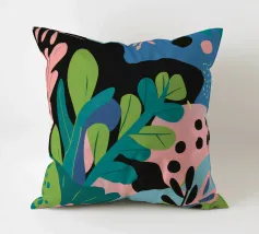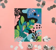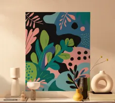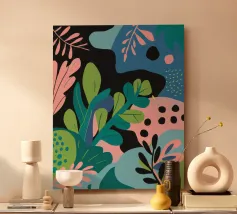 Un'opera d'arte astratta giocosa e colorata presenta forme botaniche, foglie e pois in una composizione vivace, creando un'opera d'arte moderna gioiosa ed energica.