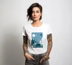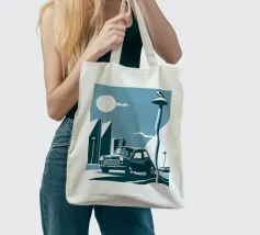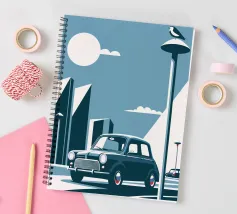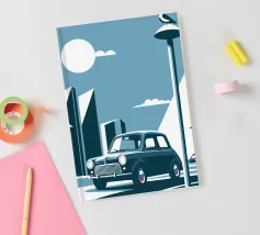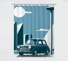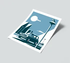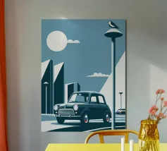 Questa immagine presenta un'interpretazione ipnotica di un'iconica auto d'epoca, catturata con dettagli nitidi in mezzo al trambusto di una città moderna.