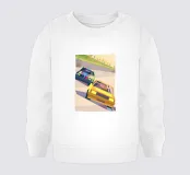 Illustrazione di due auto da corsa che si sfidano in pista con uno stile geometrico dinamico.