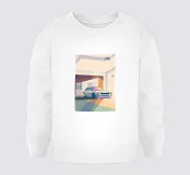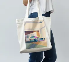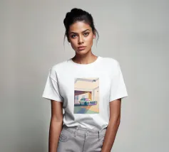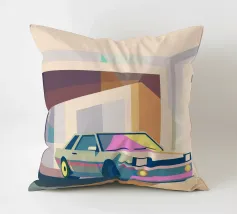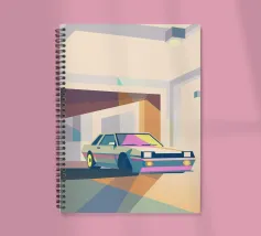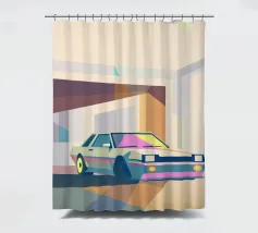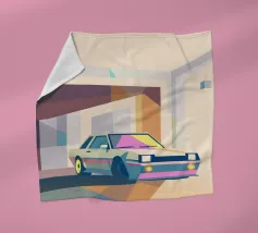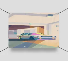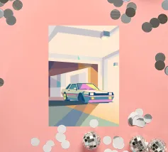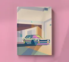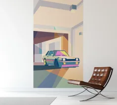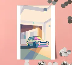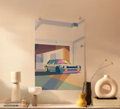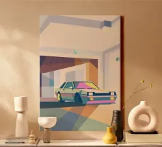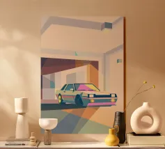 Illustrazione di un'auto in un garage con uno stile geometrico moderno. Perfetta per poster, decorazioni di ambienti o materiale promozionale a tema automobilistico e domestico.