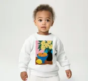 Un'elegante e semplice natura morta con un bouquet di fiori gialli in un vaso scuro accanto a una ciotola blu profondo piena di arance fresche. La composizione è serena e senza tempo, con un bel contrasto di colori.