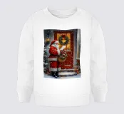 Un tradizionale motivo natalizio: Babbo Natale con cappotto rosso e sacco dei regali si trova davanti a una porta d'ingresso rossa, decorata con una ghirlanda, luci e regali. La delicata nevicata e i colori caldi creano un'atmosfera di festa nostalgica e piena di magia e gioia. Perfetto come immagine natalizia, poster di Babbo Natale, arte natalizia retrò, illustrazione invernale, arte murale festosa, idea regalo di Natale, arte natalizia nostalgica, decorazione natalizia, poster festivo, opera d'arte natalizia e accogliente decorazione domestica.