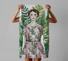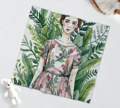 Avvolta da motivi floreali, una figura si erge con grazia tra la vegetazione lussureggiante. Foglie vibranti e petali rigogliosi incorniciano la loro silhouette, formando un ipnotico tableau naturale.